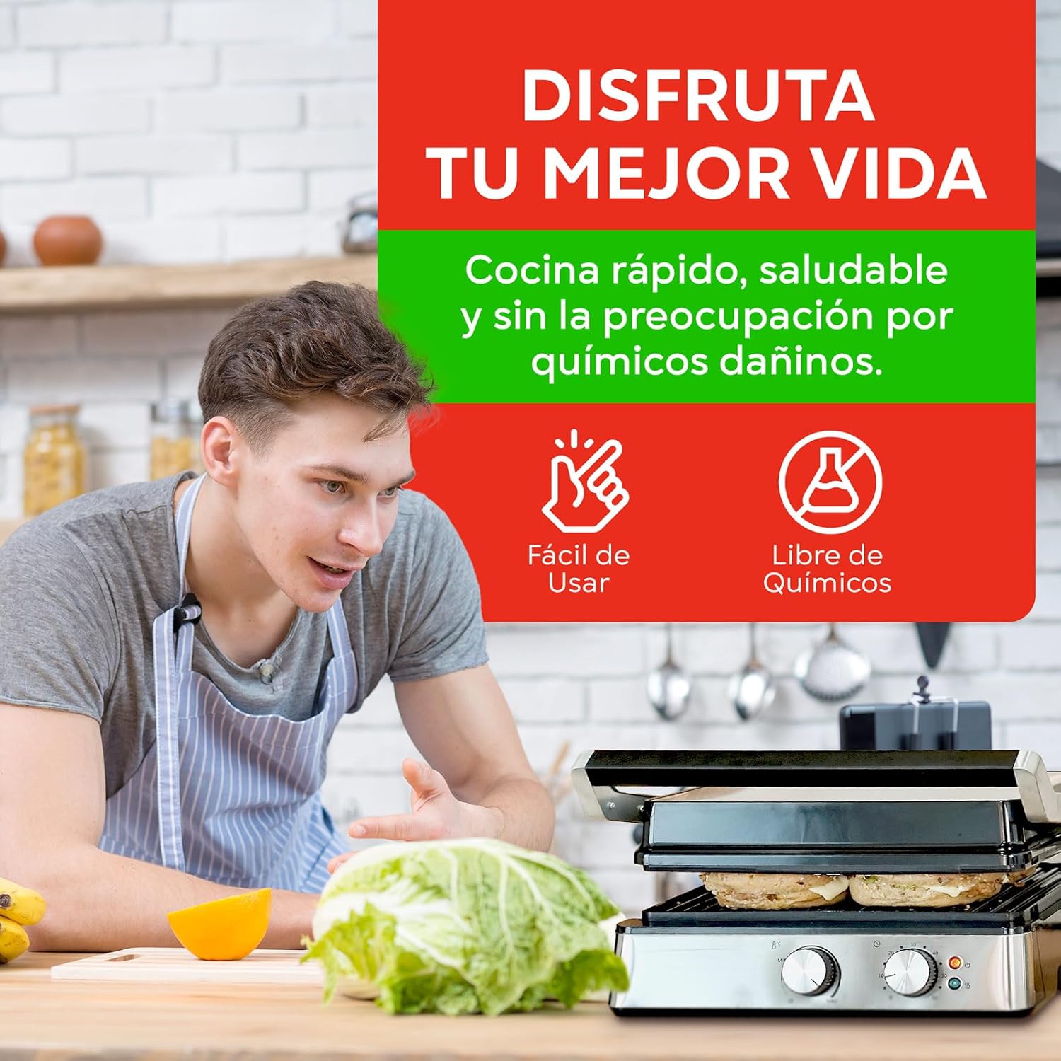 Esta parrilla es adecuada para paninis, carne, pescado, verduras y sándwiches, gracias a su termostato ajustable.